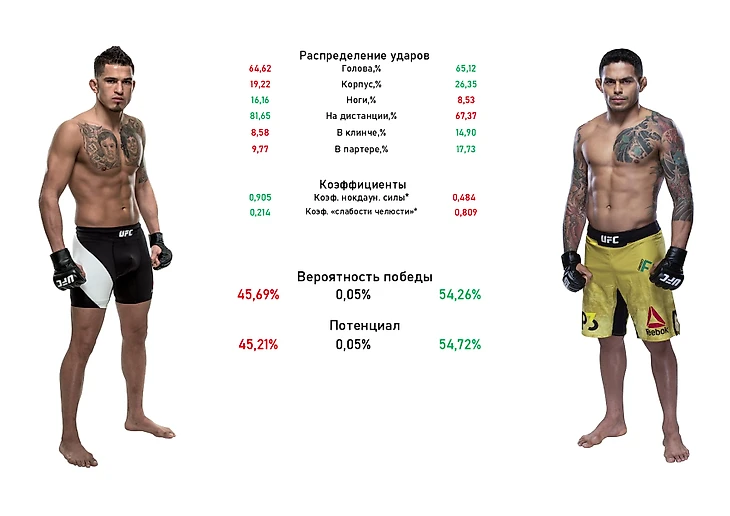 Вероятность победы и потенциал. Наша гордость. Способ его расчета мы храним за семью печатями. Для легкого понимания смысла этих значений, представьте, что вы заставляете 10000 раз биться между собой этих бойцов. Так вот, из этих поединков, победу решением судей 4569 раз одержит Петтис, 5426 раз победит Феррейра и 5 раз поединок закончится ничьей. А отличаются значения "вероятность победы" и "потенциал" потому что для их расчета использовались фактические значения бойцов из предыдущих боев и их потенциальные значения, которым мы дали собственную оценку.
