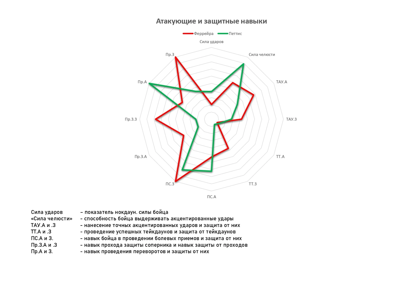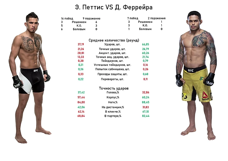 Акцентированные удары (31% против 68%). Феррейра наносит больше и пропускает меньше акцентированных ударов, нежели Петтис, поэтому шансы того, что он сможет перебить по ударам Петтиса выше почти в 2 раза.