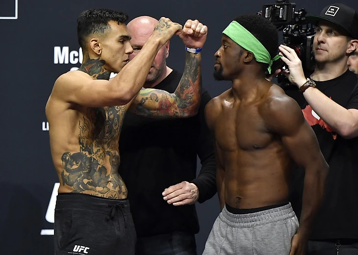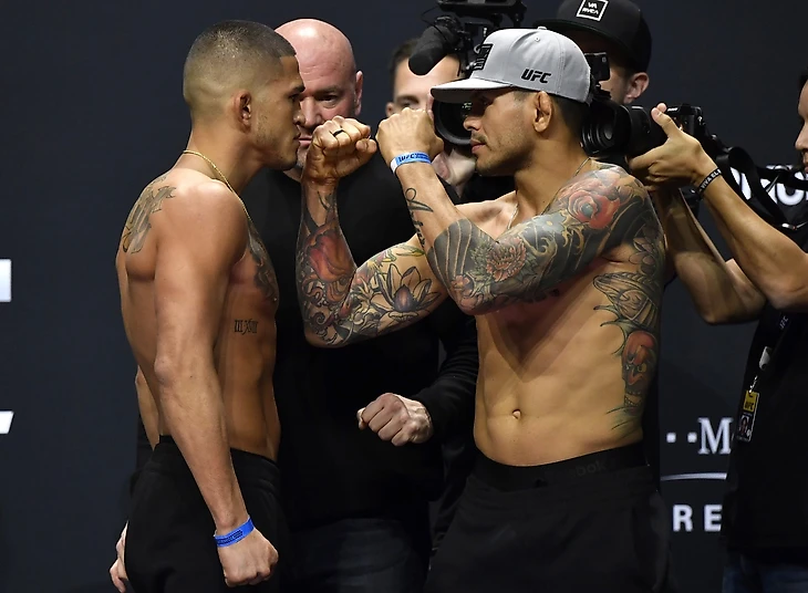 Главный кард откроется поединком Шоутайма и рвущимся к вершине лёгкого дивизиона Диего Феррейры. Для Энтони продолжается серия из максимально жёстких соперников. На протяжении последних лет часто приходилось слышать о беззубости, бесхарактерности и отсутствии воли у Петтиса. Всё это идёт в противоречие с тем, что на протяжении уже нескольких лет пуэрториканец встречается с самыми жёсткими парнями лёгкого, полулёгкого и даже полусреднего дивизионов ( РДА, Альварез, Барбоза, Холлоуэй, Порье, Фергюсон, Томпсон, Диаз). На этот раз ему также противостоит серьёзнейший оппонент - идущий на серии из 5 побед бразилец Феррейра. Две свои последние победы Диего одержал над Маирбеком Тайсумовым и Рустамом Хабиловым. А проигрывал Феррейра последний раз аж в 2015 году Дастину Порье. Справедливости ради нужно отметить, что дерётся бразилец крайне редко - в среднем один поединок за полгода. Несмотря на это, по мнению букмекеров, Феррейра является явным фаворитом этого поединка (1.4 против 3 на Петтиса). Феррейра выбрасывает больше акцентированных ударов в минуту, нежели Петтис и имеет хороший процент защиты от тейкдаунов ( 67%). Энтони же ведёт серию из 9 (!!!) боёв, в которых бывший чемпион не может выйти даже на две победы подряд, причины чему стоит видеть, конечно же, в уровне оппонентов. Если следовать этой серии, то сегодня ночью Шоутайм должен одержать победу, что будет очень непросто. Бой наверняка пройдет в стойке и здесь решающим фактором станет геймлпан команды Петтиса. В бою против Нейта Диаса для стоктонца были созданы все условия для победы, в первую очередь, из-за ужасного плана на бой (либо его несоблюдения, что наверняка ближе к истине, учитывая осипший голос Дюка Руфуса в перерывах между раундами). Петтис должен быть максимально активен в клетке, в противном случае Феррейра не упустит момент уложить его на канвас.