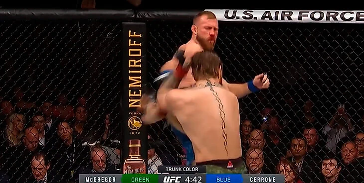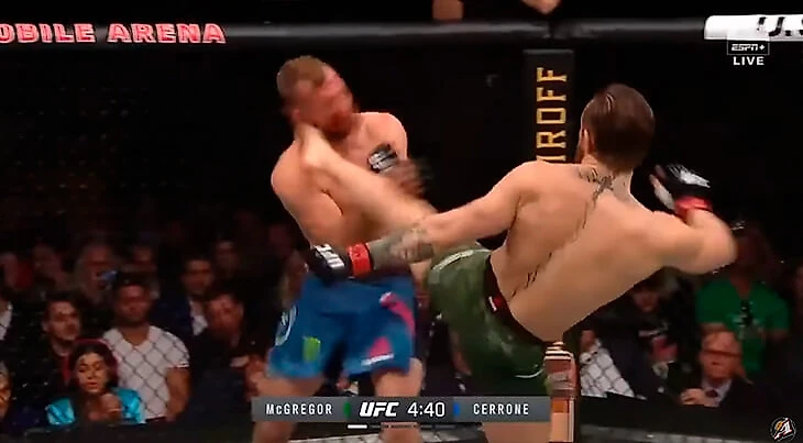 Точно такой же эпизод был в бою с Хабибом, только на 12-й секунде. Конор поддавливал и пробил ногой в голову. Разница в том, что Нурмагомедов успешно этот выстрел заблокировал, а Серроне поймал удар челюстью.