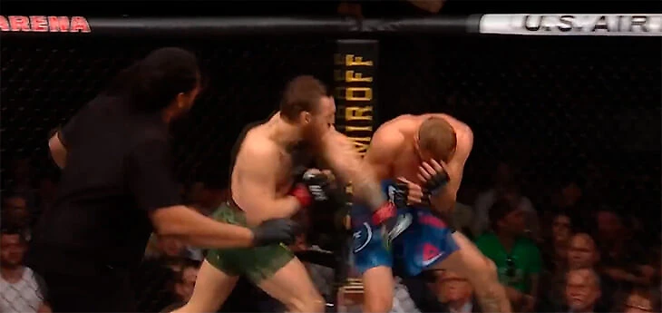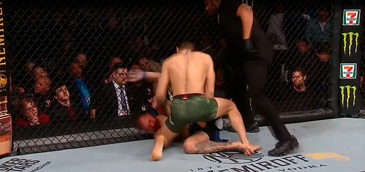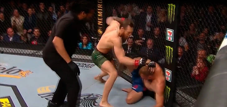 Колено – абсолютно актуальное при сопернике в нокдауне у клетки. После чего Конор заходит слева – оттуда по нему сложнее попасть, оттуда ему удобнее работать левой рукой.