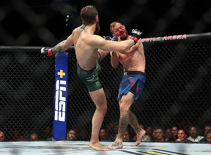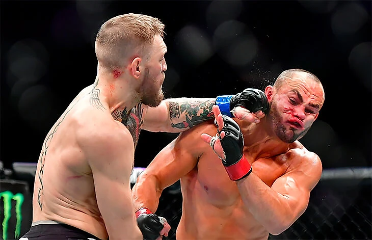 • Конор нанес 90 ударов (40 дошли до цели). То есть перебил соперника ровно в два раза с процентом точности 44. При этом Макгрегор постоянно шел вперед, попадал даже на контратаках (уклон-удар), и как боец он быстрее – потому что пришел из полулегкого веса.