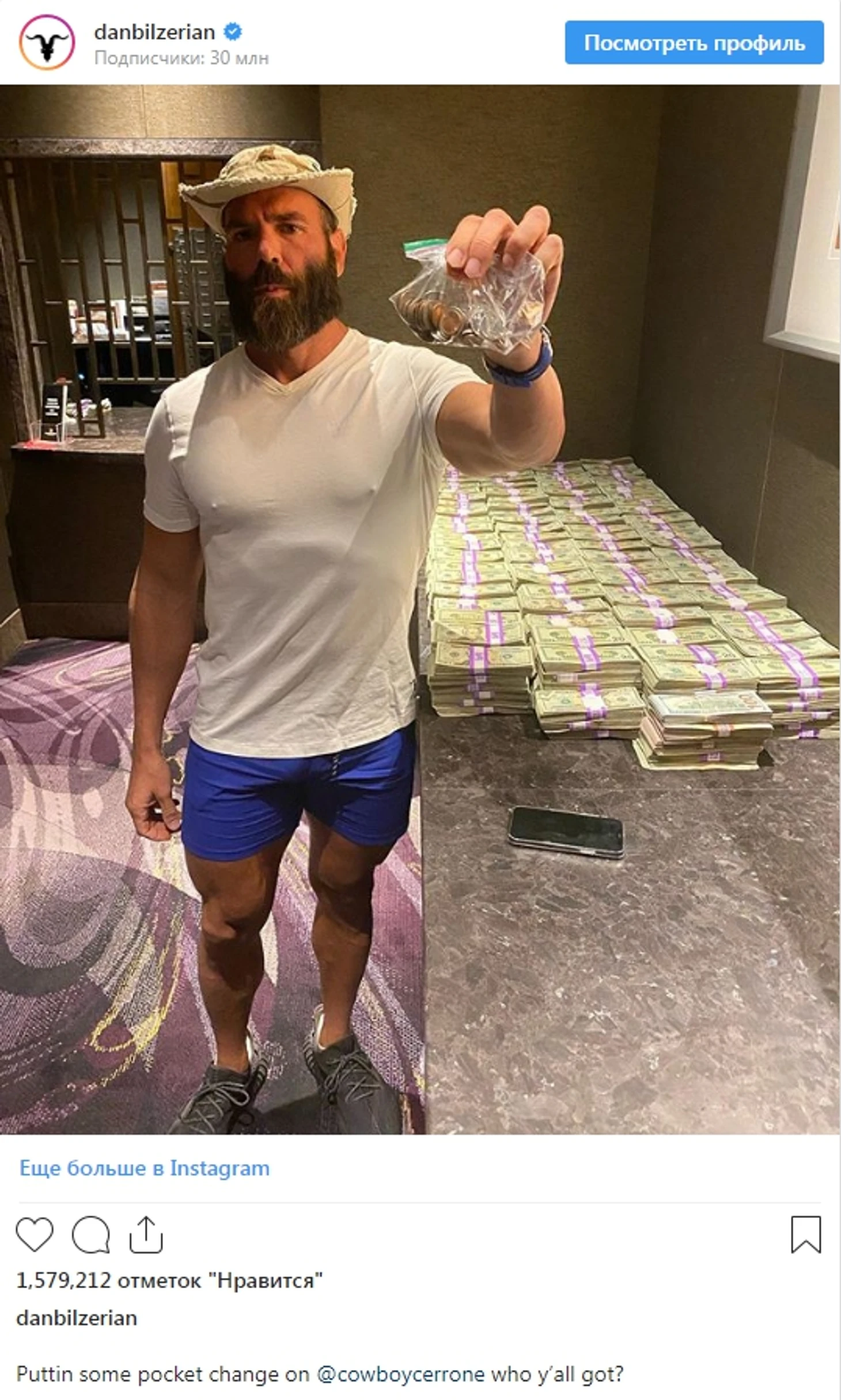 «Поставил немного карманной мелочи на «Ковбоя» Серроне. На кого ставите?», - Билзерян подписал фото в Инстаграме, на котором продемонстрировал впечатляющую ставку.