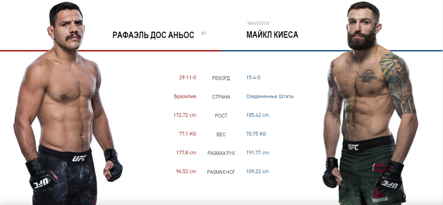 Рафаэль Дос Аньос – это крепкий боец с хорошим запасом выносливости: больше половины его поединков длились по три и больше раундов (в зависимости от регламента), причём, со стилистически разными соперниками. РДА способен выжидать, пережидать и ожидать. Он дрался до конца с рассечением против Эдвардса, он поймал горделивого Кевина Ли в треугольник и отлежал пять раундов в объятьях Усмана. Не думаю, что Кьеза составит ему больших трудностей.