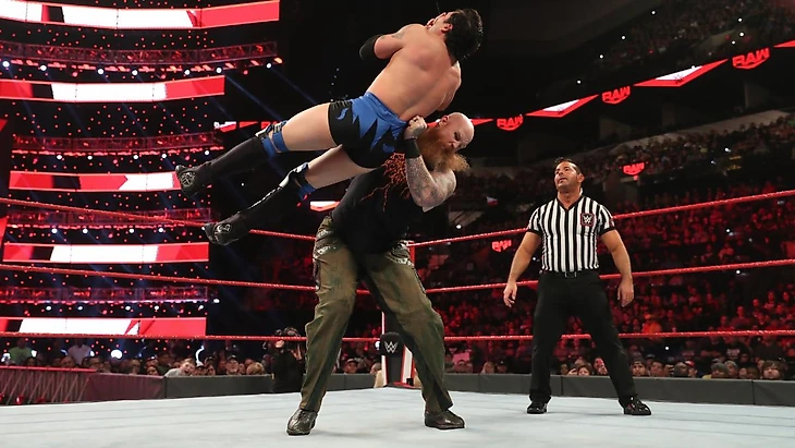 Нам мельком напомнили, что месяц назад чемпион травмировал претендента с помощью фирменного DDT на бетон. Подобное он пытался провернуть и на прошлой неделе с Мистерио, но его вовремя остановил восстановившийся Каррийо.