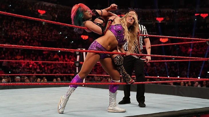 В один момент Аска смогла провести missile dropkick, а потом зафиксировала болевой на шею. Однако Королева смогла выпутаться и огреть ее целой серией чопов. Spanish Fly не удался, и Шарлотт улетела за пределы ринга.