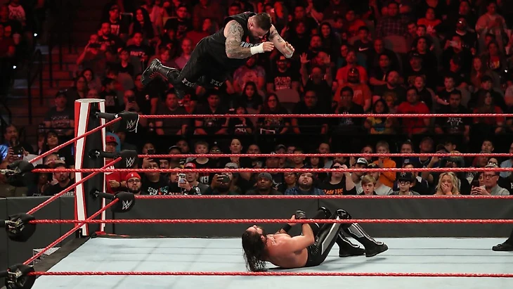 Оуэнса это все достало, он отправил Сета за ринг и нейтрализовал его планчей, но угодил под удар коленом. Произошел словно момент из прошлой недели, когда Роллинс закончил матч, пригвоздив Эрика Стомпом в апрон. Но на этот раз этого не произошло. Кевин начал отбиваться от противников, провел Stunner Мессии, но был свернут австралийцем.