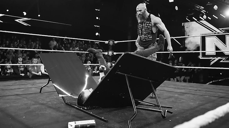 И после гонга Балор продолжил по-новой бить Севена, перейдя потом к стомпам у канатов и basement-дропкику. Далее был чоп и с отсчётом рефери оба вернулись в ринг, где Финн принял доминирующую роль и даже попытки Трент отбиться были сброшены в трубу после double-foot стомпа. "Принц" всея NXT не останавливался и добивал бодислэм и elbow-дропом - удержание сорвалось на 2, но и Севен попытался что-то сделать, также свернув Финна - пусть и до 2. Усач провёл пару чопов, а Балор ответил слингблэйдом и принял выламывать и шею, и руку Трента - под конец и вовсе пробил очередной чоп в горло британца. Во время перерыва Финн снова зарядил новую серию стомпов и стал гонять Севена по рингу, разбавляя это ударами и чопами - удержание после этой серии было снова до 2.