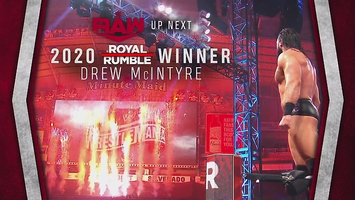 — Хайлайты с мэйн-ивента Royal Rumble 2020. Прежде всего показывали перформанс Брока Леснара, который успел тогда элиминировать 13 участников и застрял с Рикошетом до выхода в Битву Дрю Макинтайра. И тогда как известно - именно Дрю, пусть и с побочной помощью от Рикошета, но красиво и не менее ловко выбил Зверя Во Плоти, а после продержался в Битве до самого конца, элиминировав последним Романа Рейнса. И теперь на WrestleMania 36 нас ждёт бой между Дрю Макинтайром и Броком Леснаром за мировое чемпионство RAW WWE (Боязно делать ставку на Дрю, вспоминая мэйн-ивент WrestleMania 34, но я готов снова рискнуть и поставить на Дрю);