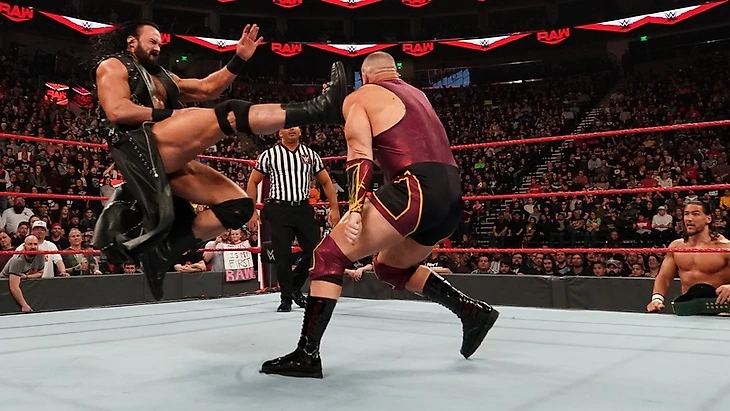 — Сам победитель мужской Королевской битвы 2020 вышел на ринг, причём на нём ещё оставался Моджо Роули и позировал со своим титулом, явно перед Дрю. Впрочем это не мешало шотландцу - он поблагодарил публику за внимание к Дрю, обратился к Роули насчёт обещания снести ему голову за 3 секунды и начал говорить о том, что случилось на прошлой неделе. Ведь Леснар атаковал Дрю на прошлой неделе из-за страха перед обаянием такого горячего шотландца как он. Ибо он большой в росте, крайне сильный физически и имеет самое эффективное оружие в мире - Claymore. Поэтому на Мании шотландец просто снесёт голову Леснару и тем самым лишит Зверя его трофея, мирового чемпионства WWE. Далее Дрю извинился перед Роули за то, что чуть не забыл о нём и своём обещании и матч стартовал...
