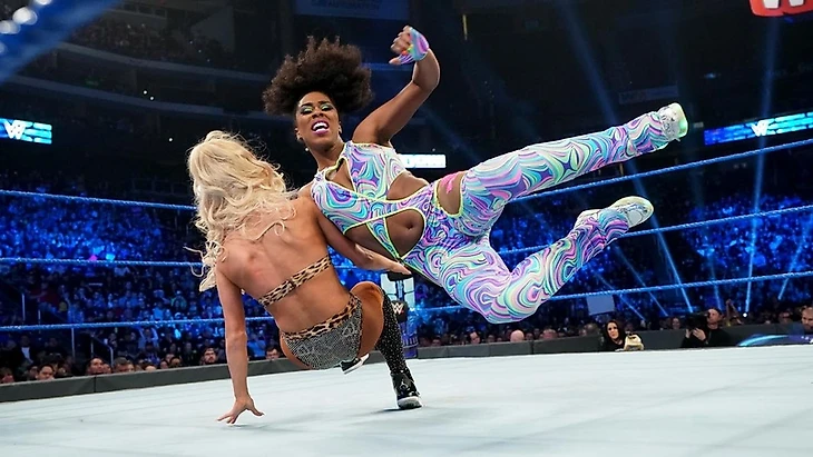 А после появления у комментаторского стола женской чемпионки бренда, уже стала выходить Кармелла, что является сигналом к тому самому матчу...