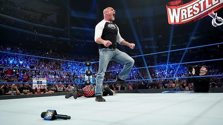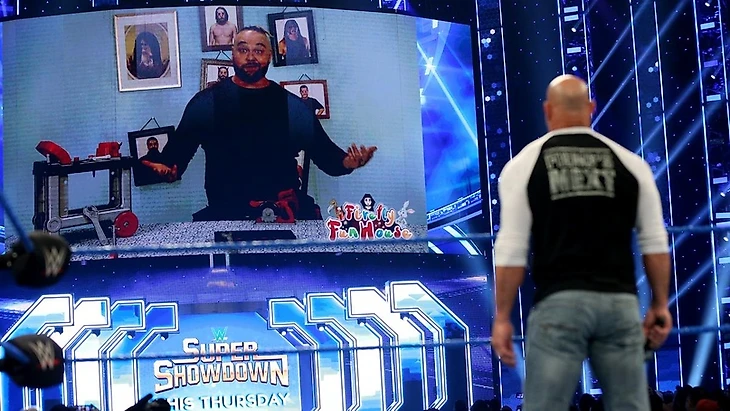 После рекламы наступил тот самый миг - член Зала Славы WWE и легенда WCW Билл Голдберг был готов явится Вселенной WWE вживую. После длительных чантов, Билл взял своё слово фразой "Чертовски приятно вернуться сюда". Дальше он обратился к нему, именно к "нему" - пока не объявилось Firefly Fun House с Брэем Уайаттом со строительными принадлежностями. Голдберг не был намерен играть с Уайаттом по его правилам и требовал, что тот вышел к нему. Уайатт успел припугнуть героев своего шоу, после чего указал кто хочет встретиться с ним. Свет гаснет и...
