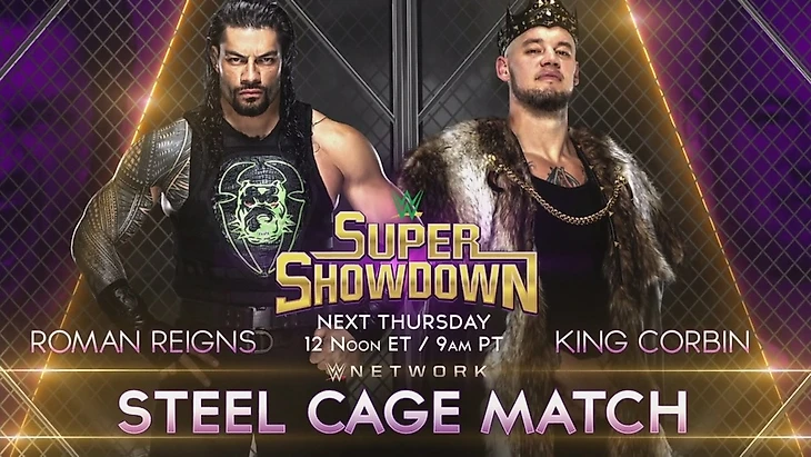 — Нам стали напомнить о течении противостояния между Романом Рейнсом и "Королём" Бэроном Корбином, который обрёл характер многостороннего противостояния, но не снизил накала страстей между главными героями фьюда. Хоть в многосторонних баталиях Рейнсу и его братанами удавалось выравниваться, но в очных встречах преимущество оставалось за "Королём". А после требования Корбина на ещё один бой, Роман ответил согласием, но на своих условиях. И как итог, в Аравии пройдёт ещё один их бой по правилам Steel Cage Match;