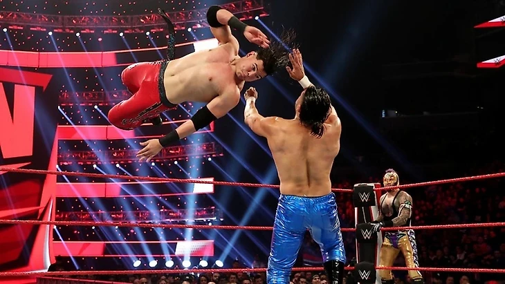 Матч начали Умберто и Андраде. Алмас получил несколько чопов и ушёл отдохнуть за пределы ринга. Рей хотел провести ему Hurricanran`у, но в итоге улетел головой в баррикаду. Умберто пришлось тащить бой в одиночку. Он смог отбиться. В это время к углу ринга подошёл Мистерио. Фейсы раскидали хилов, а дальше шоу ушло на паузу. После рекламы контроль держали хилы. Гарза душил Умберто, пока тот не дополз до Рея. Он разбил в кровь (немножко) лицо Андраде, проведя тому Tornado DDT. Со второй попытки Рей смог провести 619, причём обоим соперникам. На ринге остались Умберто и почти мёртвый Андраде. Moonsault от Каррийо поставил жирную точку в этом матче.