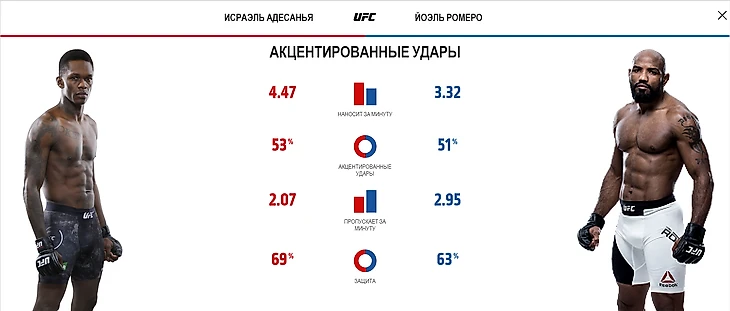 При одинаковой точности соперников, Адесанья наносит больше акцентированных ударов. Ромеро больше пропускает.
