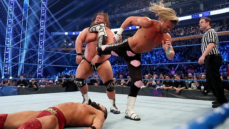 А теперь Механизму предстояло пройти через самих командных чемпионов бренда. Такер был окружён чемпионами и принялся получать на орехи, как и на прочие места - как итог Джон пробил springboard-энзигири, но удержание оказалось неудачным. Сразу же чемпионы начали проводить жёсткие удары - Джон провёл bicycle knee, Миз running-бут. Пошла командная работа у канатов, но удержание после slingshot-элбоу было до 2. Моррисон не щадил Такера, используя его усталость - только вот Такеру удалось собраться и вломить Моррисону клоузлайн, а также избавиться от Миза через дропкик.
