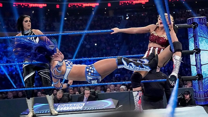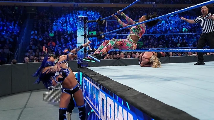 Мисс Glow Lady тут же зарядила серию Flashing Lights-киков, Бэнкс ответила коленом голову. Наоми это не остановило, и та пробила scorpion-кик и бульдог в угол. Напоследок Бэнкс прилетела и sunset-flip бомба - удержание Наоми сорвала Бэйли. Сюда же вмешалась Лэйси и получила от Саши. Эванс вылетела с ринга, а попытка Наоми провести Split-Legged Moonsault была сорвана Бэйли - Бэнкс же по-быстрому ударила Наоми коленями с угла и свернула до 3.