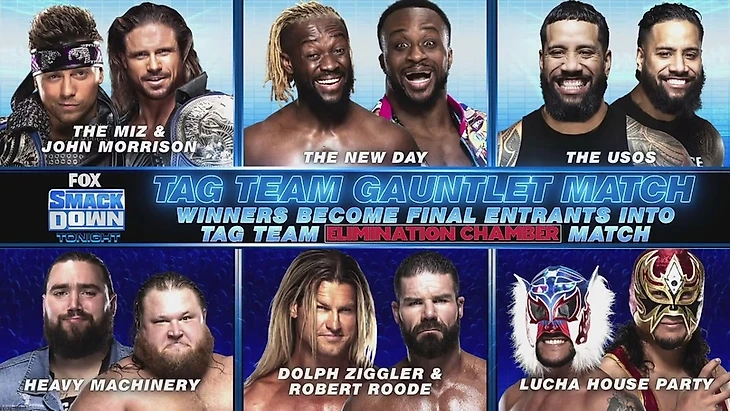 4) Миз и Джон Моррисон против The Usos против New Day против LHP против Heavy Machinary против Дольфа Зигглера и Роберта Руда - командный гаунтлет-поединок за право последнего выхода в командном Elimination Chamber-матче.
