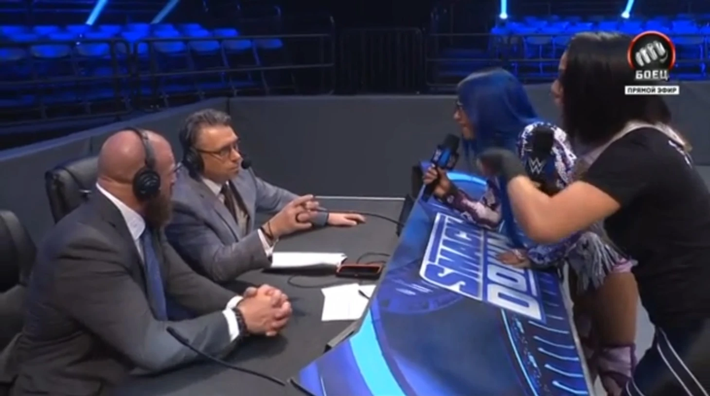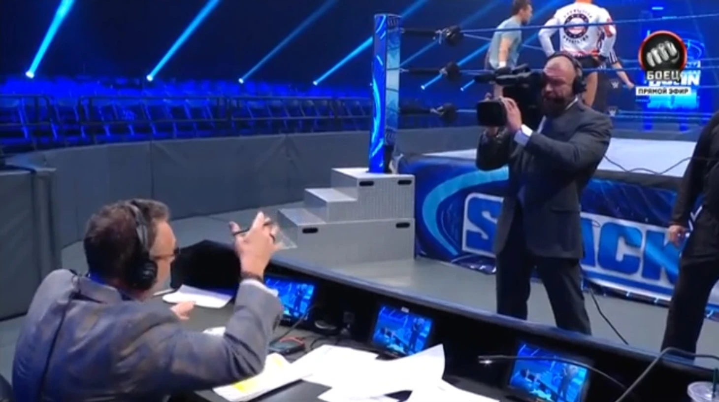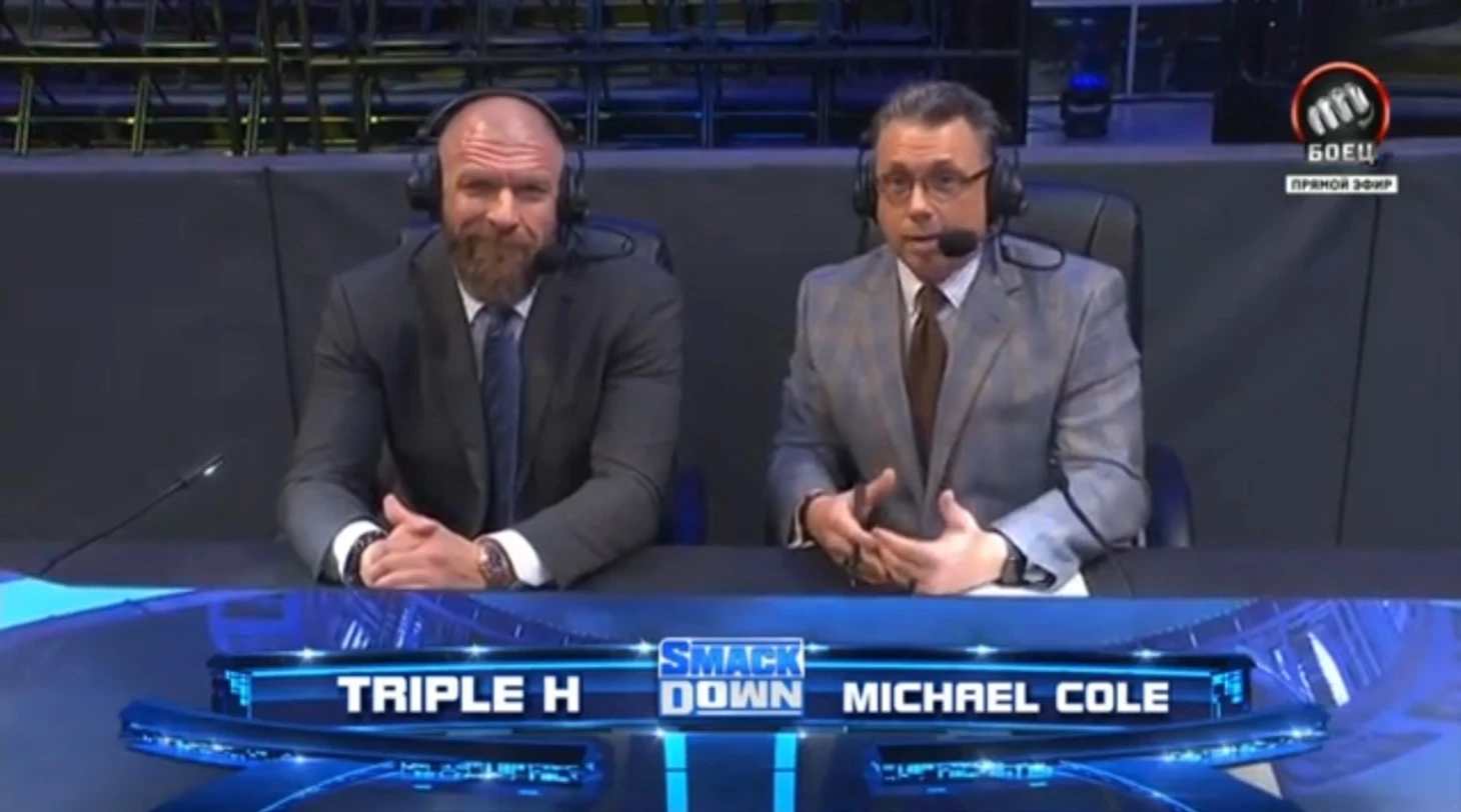 По понятным причинам, не все сотрудники WWE смогли быть в этот вечер на SmackDown. Именно поэтому на шоу работал необычный дуэт из комментаторов. К многолетнему ветерану комментирования Майклу Коулу присоединился все тот же Трипл Эйч. WWE не стали изменять себе, на лице Игрока сразу же появилась улыбка, которая хоть немного согрела душу в такой обстановке.