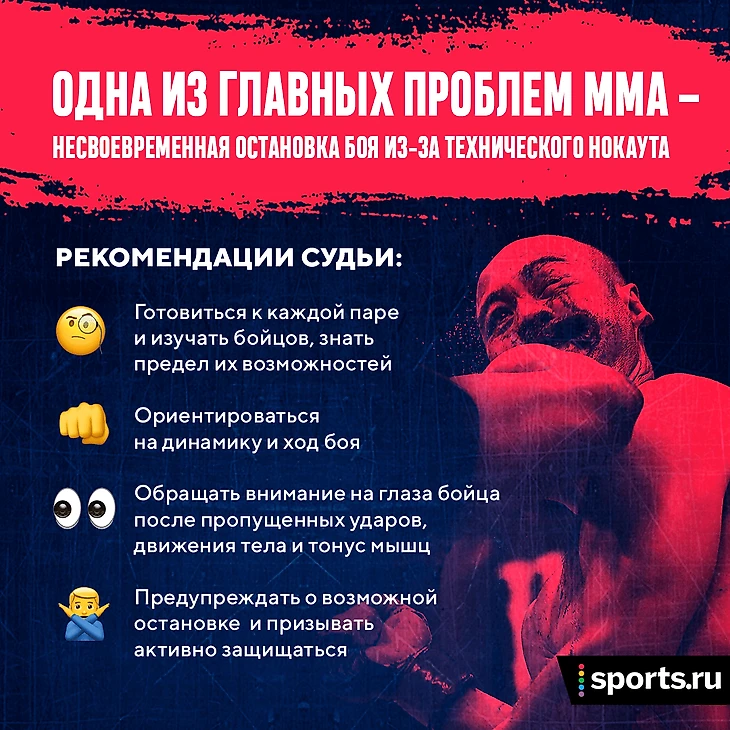 «Опытные судьи стараются работать наверняка. В больших боях доводят до ситуации, когда ни у кого не возникает сомнений в остановке боя, чтобы было общее понимание. Но это чревато претензиями о поздней остановке. Это тонкий лед, по которому судьи вынуждены идти. Каждый бой уникален: критерии одного поединка не подходят под другой.