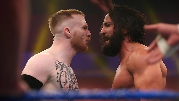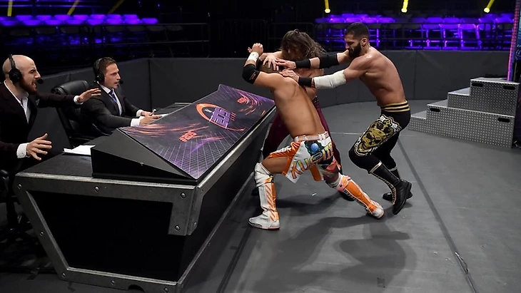 Ситуация для оригиналов стала очень опасной. В дело вступили Кендрик с Дайвари, причём последний пытался уладить всё с Галлахером, и вроде как всё получилось, пока Лоркан страдал от общих командных действий Арии с Брайаном. Они принялся постепенно выравниваться и сопротивляться напору иранца, но выходило очень слабо из-за хэдлоков и ударов от Арии. Постепенно Лоркан нашёл момент и не только перебросил Дайвари, но и столкнулся с ним синхронными клоузлайнами. Смена тэгов - и Скотт принялся коронными маневрами с мувами выносить Кендрика, из-за чего Дайвари пару раз буквально спасал Брайана от расправы. В результате Дайвари напоследок и получил суперкик от Скотта, тем самым влетев к баррикаду, однако действия Кендрика и Галлахера отразились на Исайе. Мистер Swerve чуть не пал жертвой жёстких панч-страйков от Джека, к которым последний прибавил ещё и reverse elbow-страйк. Как только тэг получил именно Ария, ситуация стала хуже - Дайвари упустил инициативу и после полёта в стойку был свернут Скоттом до 3. Кендрик тут же пытался отомстить за товарища - и также был свернут Скоттом до 3.