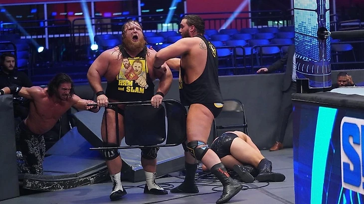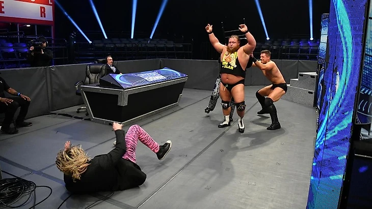 Во время выходов команд нам показали события с прошлой недели - именно тогда оформилась команда из Дэниела и Дрю для противостояния с группировкой Сэми Зейна, которая получила уже сегодня своё название. И название интернациональной компашке - The Artist Collective. Вроде бы и креативно, но всё равно отдаёт букерским кринжем.