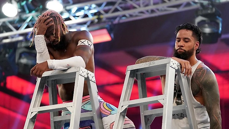 Он решил всё-таки сделать новую вылазку за титулами, если бы не прыжок от Кингстона и хуриикенрана следом от него же на Моррисоне. Последний вылетел с ринга и Кофи решил воспользоваться моментом - вмешался Усо и на готове был уже Джон с лестницей, отчего Кингстону пришлось планчей атаковать Джона и получить новый урон от этого. Кофи не сдавался и сумел даже отбиться от Джимми, который прошёлся по баррикаде для атаки. Препятствий по сути уже не было и Кофи мог бы спокойно идти за титулами, но зная уровень регенерации самоанцев - Кингстон перестраховался с Усо, сюда же вмешался и Моррисон. Казалось что оба атакуют Усо и тут Джон, пройдя по канату, провёл Spanish Fly Кофи, а Джимми добавил свой коронный сплэш Джону, минуя Кофи. Всем участникам было очень непросто и Усо решил начать прорыв к титулам - Кингстон стал мешать этому и оба через друг друга шли вперёд, т.е вверх. Джимми выдержал напор Кофи, но сам Кофи начал идти с другой и внутренней стороны и нейтрализовал Усо.