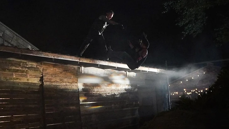 Начало боя сопровождалось встречными диалогами между бойцами - инициативу взял на себя именно Тейкер, который коронными панч-страйками прижал ЭйДжея к его же катафалку. Правда Гроб сложил рану при промахе очередного удара в стекло двери - что не помешало опрокинуть Стайлза на лобовуху. И уже на крыше тачки мистер байкер чуть ли не убивал своего оппонента - Стайлз еле дышал от града ударов иконы подземного мира. "Феноменальный" решил так просто не давать себя хоронить сразу и пошёл на грязную тактику, получив преимущество - тут нашему бате Тейкеру стал чуток нехорошо. Но когда это останавливало "Мертвеца" - он загнал ЭйДжея в могилу, правда на его душёнку прибыли Андерсон и Гэллоуз с партией друидов.