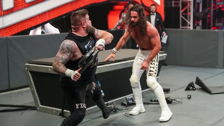 КО был готов атаковать первым, но инициативу взял Сет и оба вышли с ринга для полноценной драки. Роллинс действовал аккуратно и ловко - он вернулся в ринг и как только выждал момент, приготовил Blackout. Только вот и Кевин был готов, уйдя в сторону и атаковав "Архитектора" снова - ответные выпады от Сета не имели эффекта, в отличие от Оуэнса с 2 сэнтонами. Сет был вынужден уйти с ринга, Кевин последовал за ним и гонял как непослушную псину. Роллинс держал удар перед атаками от Оуэнса и оба оказались на апроне - КО чуть ли не затизерил свой старый финишер со времён ROH, но Сет ответил на это переводом в Falcon Arrow прямо об апрон. Удар был хорош и Сет раззадорился - помимо слов о себе любимом в качестве нового божества, "Мессия" расщедрился на 2 суисайд-дайва - правда с третьим заходом он обломился из-за ответа Кевина и пришлось задействовать слингблэйд.