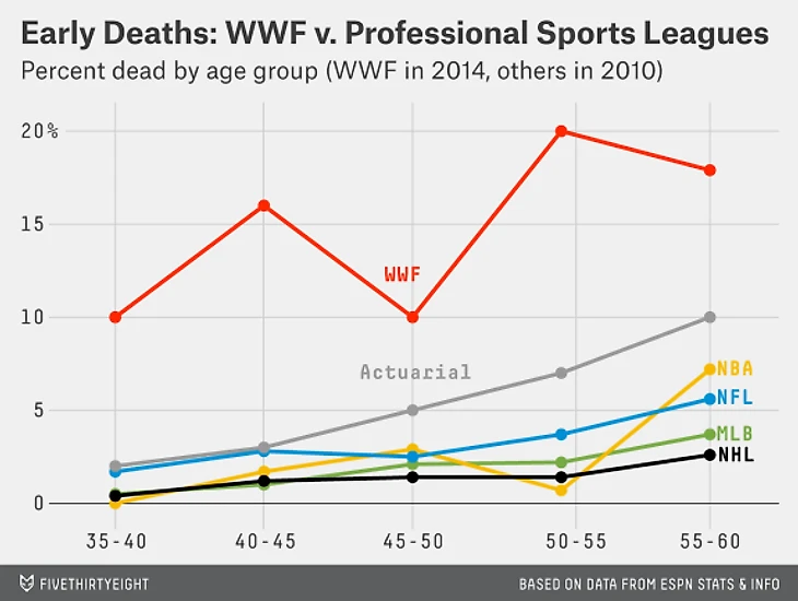 Медиа FiveThirtyEight.com (журналистика данных, делают понятную и актуальную инфографику) выкатило страшную статистику по ранним смертям в американском профессиональном спорте. Оказалось, что в WWF (Мировая федерация рестлинга, сейчас WWE) – самые пугающие показатели.