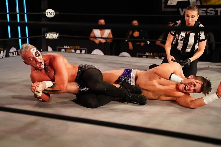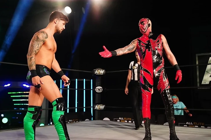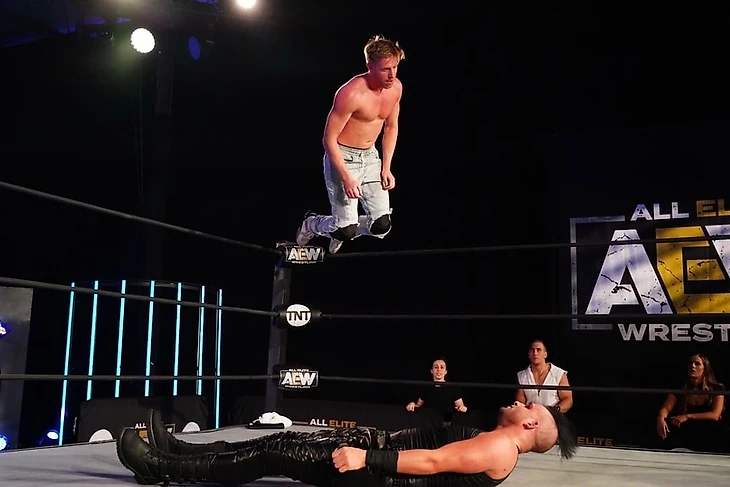 После промо, в котором Тэзз рассказал нам о крутости V-Trigger и снэп дрэгон суплексов от Кенни Омеги, нас ждал матч с участием командного чемпиона мира AEW. Начался бой с классического чейн-рестлинга, после чего Кенни провел шоулдер тэкл, затем попытался выти на снэпдрэгон, но неудачно. Алан попробовал было реверсировать в немецкий суплекс, но получил пару чопов, хэдбатт… и снова снэп дрэгон суплекс не прошел, а Энджелс провел дропкико в колено и сентон на спину соперника. Попытку второго сентона Омега встретил коленями, провел бэкбрейкер до 2 и снова пустил в дело чопы. Потом он принялся обрабатывать Алана в углах, но тот отбился и сам нанес несколько ударов в углу, пока не был пойман жестким ударом. Он укатился к канатам, схватил «фартук» ринга, а потом отбился от попытки атаки Кенни, и ускользнул на апрон, где реверсировал выход на снэпдрэгон, видимо, атаковав Омегу о верхний канат. Стоял «Чистильщик», кстати, на том самом «фартуке», который Алан затянул в ринг, так что он потянул за фартук, и Кенни упал, неприятно приземлившись на спину. Тут же Энджелс залетел в четырехугольник слингшот дропкиком до 2. С этотго момента начался период доминирования Алана, в ходе которого он, в основном пользовался киками, но в итоге все равно попал под снэп дрэгон суплекс. V-Trigger у канатов последовал до 2. Связка из гатренч бомбы и еще одного V-Trigger поставила наконец точку в матче, принеся Омеге такую регулярную победу.