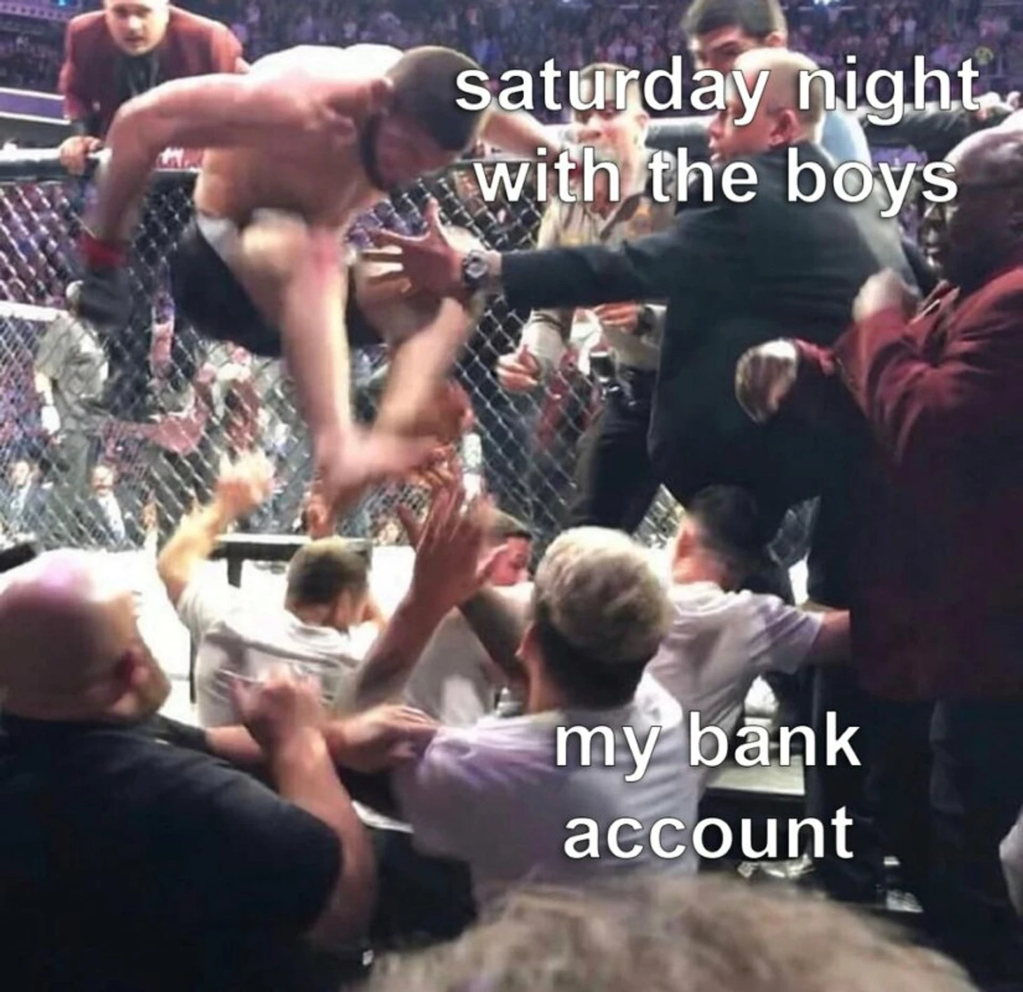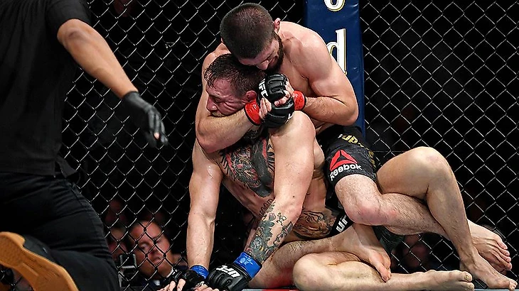 Хабиб и Конор не показали бой вечера в октагоне, но сделали все, чтобы в тот день про них говорил весь мир. После победы Нурмагомедов выпрыгнул из клетки на команду Макгрегора, пока ирландец сражался в октагоне с тусовкой «Орла». Как итог, всем штрафы + слухи о возможном отстранении тимы дагестанца. Все разрешилось в пользу нарушителей правопорядка, поэтому игра стоила свеч. Дана Уайт так и не надел пояс чемпиона UFC на россиянина, чтобы зрители не закидали октагон подручными предметами.