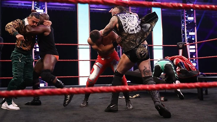 Зелина осталась на рингсайде. Начали бой Гарза и Блэк. После короткого рукопожатия, которым Гарза, очевидно, пытался подловить Алистера на какую-нибудь подляну, пошел чейн-рестлинг, и тут преимущество было на стороне голландца. Энджел реверсировал, провел несколько лоу киков, но получил парочку неприятных ап киков и хип тосс, после чего Блэк внов затащил его в борьбу. Гарза вновь попытался реверсировать, но получил подсечку, не очень приятный бросок, и вновь стал мучиться в захвате. Тэг был передан Аполло Крюсу, и он моментально же стал жертвой чопа, и Энджел передал право ведения боя Остину. Тиори же сразу получил суплекс, потом дропкик и суплекс, и в матч отправился Рей Мистерио. Какое-то время он сохранял контроль, завоеванный его командой, даже вышел было на 619 и Гарзе, и Тиори, но это дело прервал Андраде. Однако уже через мгновение и он чуть не пал жертвой 619. В конечном счете, все «плохие» парни оказались за пределами четырехугольника, а Блэк и Крюс одарили их дайвами. Вернувшись с рекламы мы стали смотреть, как Андраде избивает Алистера в своем углу, а продолжил это дело Тиори. В общем, начался фестиваль страданий Блэка длинною в вечность. Но, естественно, голландец сумел уйти от одной из атак, провести сворачивание и отбиться от Остина киком, передав право ведения боя Рею. Из противоположного угла вышел Андраде, и ветеран не оставллял ни шанса чемпиону Соединенных Штатов своими классическими атаками… пока Андраде не поймал его фэйсбастером. Тем не менее, уже следующую атаку, причем командную, Андраде и Гарзы Мистерио реверсировал, отправив «Эль Идоло» за пределы ринга, но почти сразу получил слэм и был послан слайдом на рингсайд, а шоу ушло на перерыв. После рекламы Рей страдал от слаженной командной работы противников. В конце концов Мистерио отбился от Андраде своим энзигури, а потом поймал его коронным DDT, сумев после этого передать «горячий» прям как Зелина Вега тэг Аполло. Крюс стал разносить вообще всех соперников, но больше всех досталось «легальному» Тиори. Пауэрслэм до 2, потому что Андраде разбил удержание. Тут же Остин провел ему некбрейкер на колено, однако только до 2. Аполло попытался провести суплекс, но Тиори ушел, передал «слепой» тэг Андраде, и мексиканец опустил канаты, когда к ним приблизился Крюс, так что Аполло улетел за пределы ринга. Тут же Остин получил колено от Блэка за безобразие, учиненное его командой, но в челюсть Алистера прилетел суперкик Гарзы. Энджел в свою очередь пал жертвой seated senton от Мистерио. Рею же достался суперкик от Андраде. Когда Крюс вернулся наконец в ринг, то чемпион Штатов поймал его коронным бэк элбоу до 2, попытался выйти на Hammerlock DDT, но Аполло перевел это дело в коронную бомбу, и принес своей команде победу в этом изнуряющем матче.