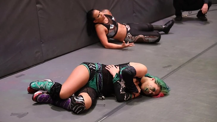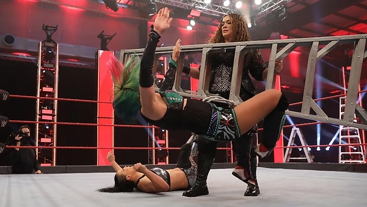 Аска вышла первой и прочитала промо, в основном на японском, в котором пожалела Каири, которую Найя дважды чуть не убила, напомнила о том, что 2 года назад она заставляла Джэкс сдаться в их матче, ну и, видимо, вознамерилась убить самоанку за то, что та сделала с Каири. Хотела «императрица» еще что-то сказать, но ее прервал выход Найи. Затем, Шэйна стащила японку из четырехугольника во время своего выхода и стала избивать на рингсайде, отправив в лестницу. Тут к вечеринке присоединились Джэкс, впечатав Шэйну в баррикаду. Попыталась она что-то противопоставить Аске, но та отбилась хай киком, а затем еще один кик самоанке достался от Бэзлер. И снова Шэйна стала мучить Аску… пока не была направлена в конструкцию из лестницы и ступенек, которую сама же создала. Развить преимущество ей не позволила Найя, вернувшаяся в движуху. Она закинула лестницу в ринг, атаковала этой самой лестницей обоих соперниц, а когда те оказались за пределами ринга, хотела кинуть лестницу в них, но в последний момент отказалась от этой затеи, и заиграла ее музыкальная тема. Матч официально так и не начался.