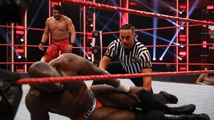 Самоа Джо, кстати, вернулся к комментированию. ЭмВиПи поприветствовал нас на RAW и напомнил, что единственный начной клуб, открытый в США сейчас, это его VIP Lounge. И сегодня его гостями станут 3 суперзвезды, которые примут участие в Money in the Bank матче — самом уникальном MitB поединке в истории. Пройдясь по тому, по каким правилам одноименные матчи на ближайшем PPV будут проходить, он по очереди пригласил Рея Мистерио, Алистера Блэка и Аполло Крюса. Причем, ведущий сказал, что делает ставку в матче за чемоданчик именно на последнего. Затем ЭмВиПи задал вопрос Мистерио о том, что для лучадора значит победа в MitB поединке, но не дав тому сказать ни слова, заявил, что знает Рея и его ответ на этот вопрос: эта победа подарит ему возможность побороться за чемпионство WWE и сделать его наследие еще более великим. Для Блэка по мнению ЭмВиПи победа в таком бою является возможностью заявить о себе еще громче. Ну а вопрос для Аполло Крюса такой: как он считает, достаточно ли он хорош, does he have what it takes, чтобы победить. Аполло забрал микрофон (видимо, чтобы с ним не обошлись так, как с Мистерио), и начал было говорить, однако его прервала музыкальная тема Андраде, который появился на стэйдже в компании Веги, Тиори и Гарзы. Зелина завела речь о том, как никто не хочет слушать и говорить про участников баталии за чемоданчик, а у всех на устах разговоры только о ее товарищах. Ведь Андраде, Энджел и Остин — это будущее RAW. Когда-то Рей, Аполло и Алистер тоже считались будущим, но они не справились с этим. В общем, потихоньку Вега пришла к мысли, что участникам матча за кейс от RAW просто нужно уступить место ее «клиентам», ведь в противном случае, красный бренд останется без чемоданчика. Рей решил ответить ей. И он предположил, ко всему прочему, что эта троица, ведомая Вегой, вышла не только для того, чтобы убедить его, Блэка и Крюса сдаться и проститься с возможностью побороться за шанс стать чемпионом. Они появились ради драки. После этих слов «хорошие» парни налетели на «плохих» и быстро выкинули их за пределы ринга. Очевидно, нас ожидает матч.