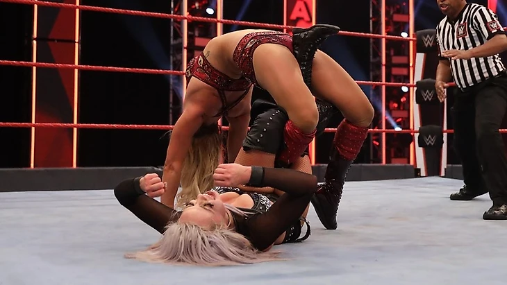 Несмотря на то, что я не очень сильно хвалил Морган за промо, вот тут она молодец, и показала, что может показывать хорошие матчи. Да, ее соперницей была Шарлотт Флэр, но тем не менее. Молодец, честное слово. Пока что самый полноценный матч на шоу и лучшее выступление Лив за хрен знает, сколько времени. Кажется, WWE услышали меня на прошлой недели, и решили дать Морган матч не на 3 минуты, а полноценный поединок. Минус же в том, что они что-то в последнее время начали лепить из Лив, она даже набрала какой-то momentum, чтобы в итоге ей устроили вот это совершенно необязательный слив Шарлотт. В роли декорации для демонстрации мощи «Королевы» можно было выбрать любую другую рестлершу. И как бы комментаторы не пытались нам сказать, что, несмотря на поражение, Лив показала, на что она способна, статистику это не меняет. Да еще и сдача от болевого… В общем, не то, чтобы прям плохое, но достаточно спорное букинг-решение.