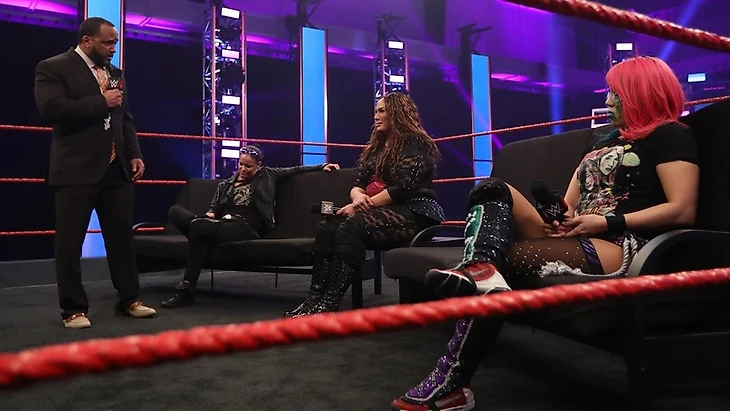 RAW опять открыл ЭмВиПи со своим VIP Lounge. Он напомнил нам о том, как на прошлой неделе его шоу, участниками которого стали участники мужского MitB матча было прервано незваными гостями, но пора двигаться дальше. Поэтому сегодня речь пойдет о женском бою за чемодан. После хайлайтов матча Аски, Шэйны и Найи, ЭмВиПи пригласил женщин на ринг. Джэкс вышла последней, и Аска даже немного подпевала ее музыкальной теме. Самоанке ведущий и задал вопрос о том, уверена ли она в своих навыках и в том, что их хватит для того, чтобы победить в «самом уникальном» MitB матче в истории. Найя ответила, что она уничтожает всех и вся на своем пути, поэтому ей вполне хватит навыков на то, чтобы повторить это дело в воскресенье. ЭмВиПи предложил Аске ответить, и «императрица» стала кричать на японском о бедной Каири и о том, что Джэкс — это большая задница, но никак не MVP. Шэйну тоже спросили о том, как она собирается выиграть этот матч. На что «Пиковая дама» с применением латыни ответила, что действия говорят больше, чем слова, и Бэзлер делает это всю свою жизнь. «Не так ли, Аска?» — обратилась она к японке. Естественно Аска решала ответить ей, много кричала что-то на японском. Дамы встали, стали смотреть друг на друга… и обратили свое внимание на Джэкс. Та только стала приподниматься, чтобы принять участие в разборках, и сразу получила кик от обоих, отправивший ее за пределы ринга. Двум бывшим великим чемпионкам NXT ЭмВиПи подраться не дал, предложив оставить все разборки и весь заряд до PPV.