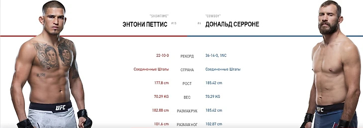 Петтис отлично бьет по корпусу и часто чередует право и левостороннюю стойку. К тому же ему только 33 года ,в то время когда ковбою уже 37. Петис будет свежее в этом бою. Если посмотреть на его последнюю победу, то он в очень непростом бою со Стивеном Томпсоном , смог перевернуть ход событий и добыть победу зрелищным нокаутом. А теперь попробуйте вспомнить поселений нокаут от Серное (чур не гуглить).