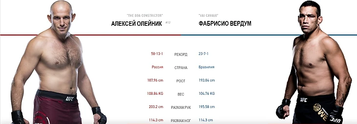 Фабрисио - бывший чемпион, проиграл свой пояс Стипе Миотичу. В последнем бою не смог нащупать свою игру и уступил Волкову. После 2 лет отсутствия 42-летний бразилец готов вернуться в элиту дивизиона. В этом же бою его стратегия очевидна- держать Олейника на дистанции или, на худой конец , в клинче и работать коленями по корпусу, как Олистар Оверим в их бою.