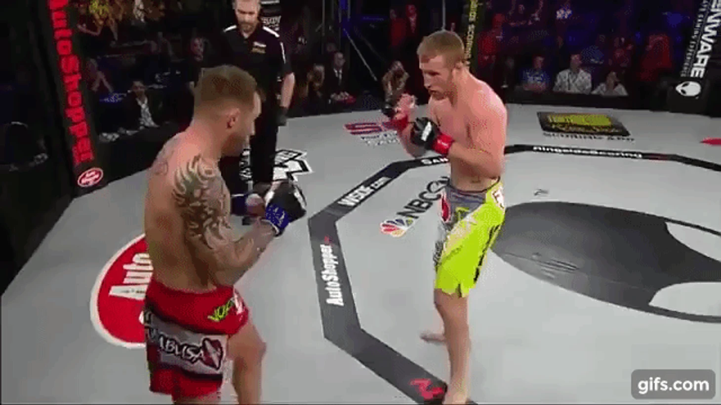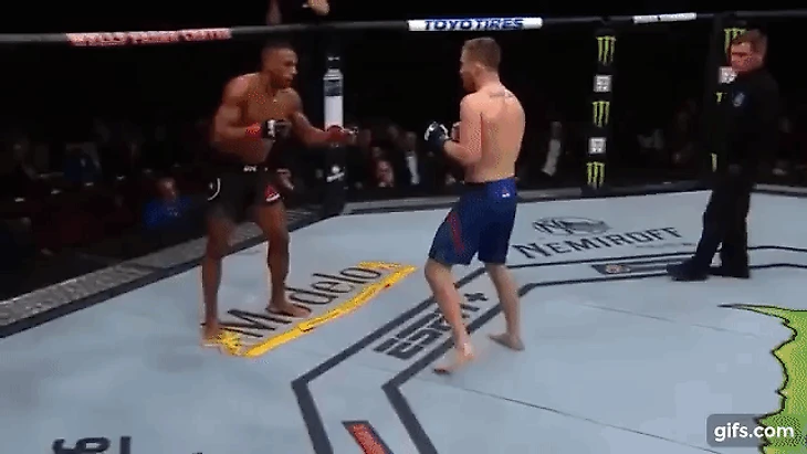 В бою против Джеймса Вика Джастин выкидывает ложный левый оверхенд, обманным манёвром он снимает блок Вика и тут же вколачивает пушечный оверхенд но уже с правой руки.