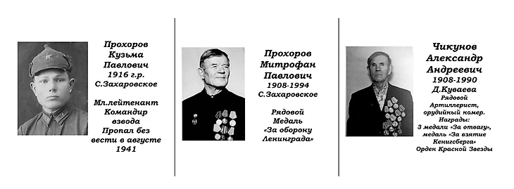 Прохоров Митрофан Павлович воевал на Ленинградском фронте в артиллерии. Награждён медалью «За оборону Ленинграда».