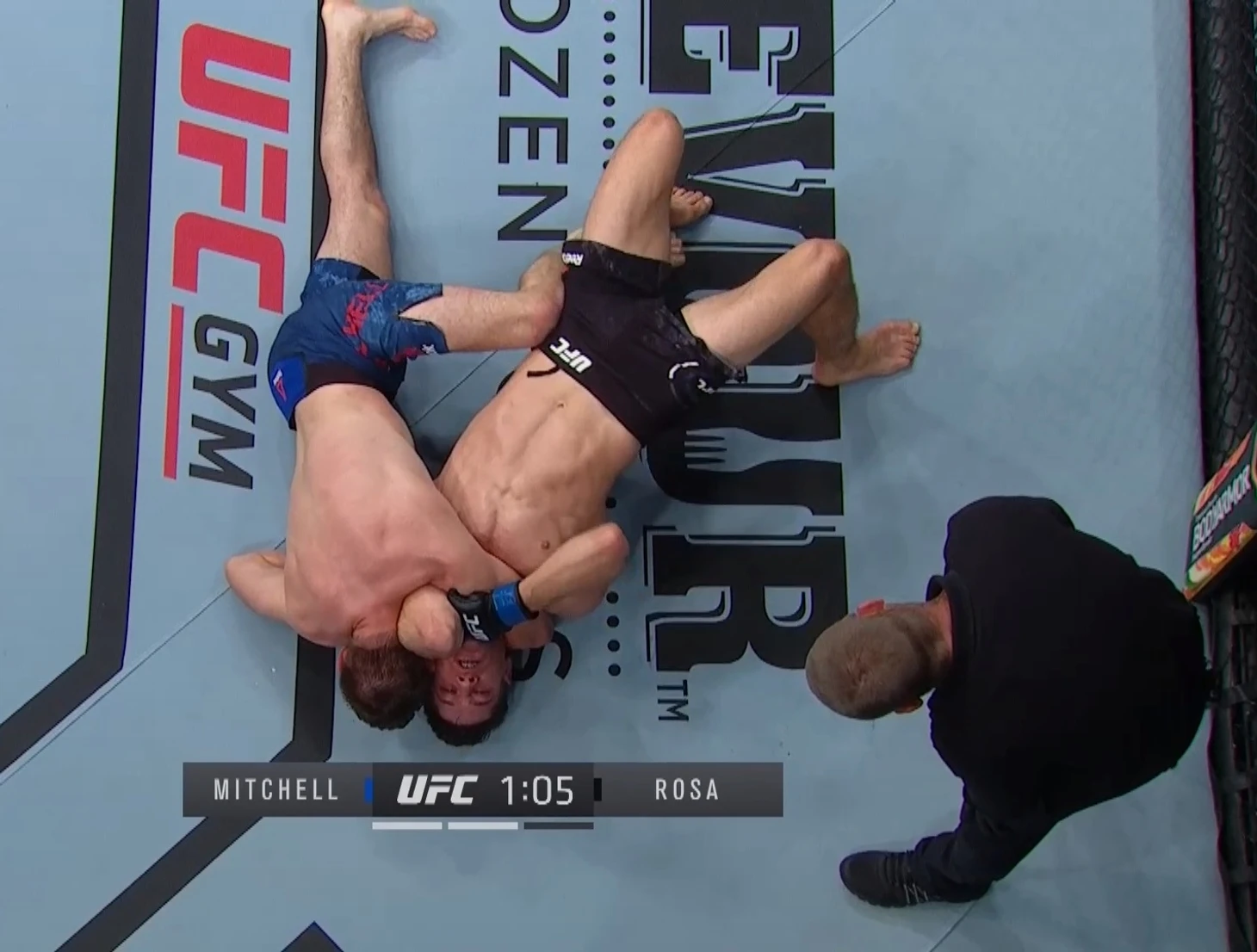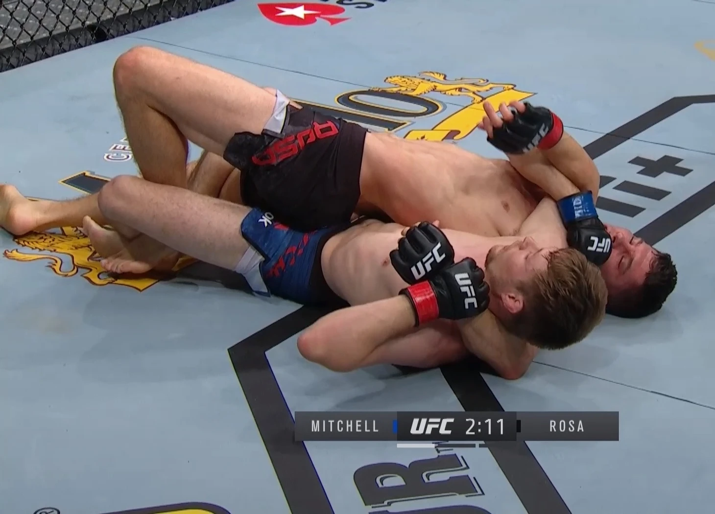 1й раунд: быстрый тейк-даун от Митчела, удушение треугольник руками, твистер, снова удушение треугольник руками.