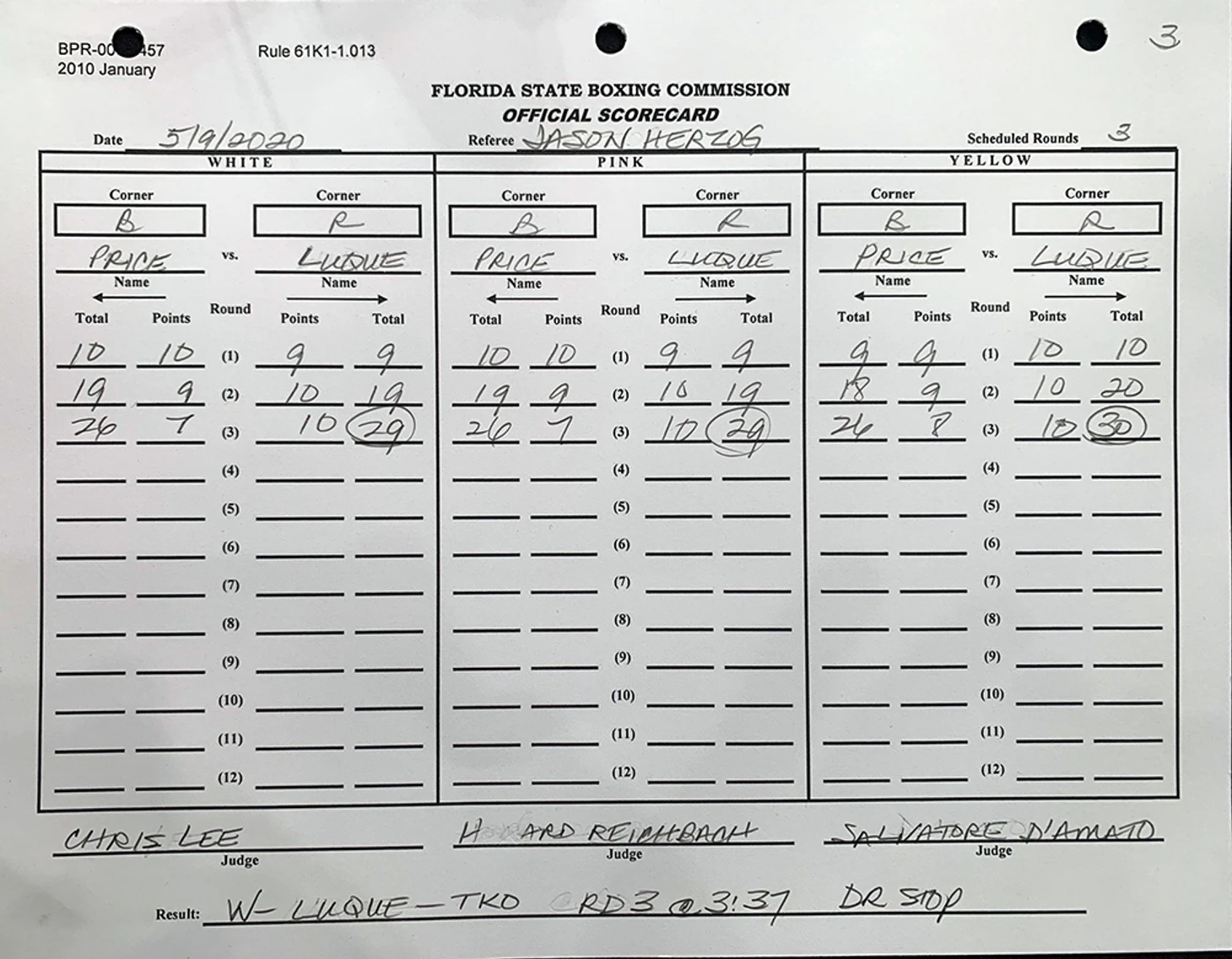 Первый раунд был полностью за Прайсем-он работал разнообразнее: джебы, фронт-кики по корпусу и в голову, тейк-даун, попытка провести "дарс-чоук", но в за пару секунд до гонга получил в размене правый овер-хенд, который его потряс .Во втором же раунде Люке забирает инициативу себе, жестко попадает в голову и методично отбивает ведущую ногу Прайса ,из-за чего тот совершает безуспешную попытку тейк-дауна, в размене на последней минуте удачнее снова бразилец.В третьем раунде идет относительно ровная игра в стойке: у Люке проходят джебы , комбинации джеб -крос ,а у Прайса лоу-кики , хотя его нога выглядит очень плохо и заметно его замедлила. В очередной атаке за 2 минуты до гонга Люке роняет левым хуком Прайса на канвас и включает граунд-энд-паунд. Нико отвечает локтями из гарда и встает.Но бой приостанавливают - у Прайса большое рассечение, нужна консультация врача. Доктор не дает бойцам завершить бой. Победа Люке техническим нокаутом..