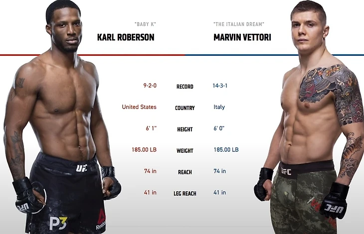 Робертсон 4-2 в UFC ,куда попал через претендентскую серию Даны Вайта, победив нашего недавнего знакомого Райана Спэна. Одерживает победу в дебютном бою над Дераном Стюардом, а затем прогревает Цезарю Ферейре. А его оппонент Мартин Веттори, наоборот побеждал Цезаря, до этого уступил раздельным решением действующему чемпиону дивизиона Адесаньи. На данный момент идет на серии из 2 побед, как и его оппонент.