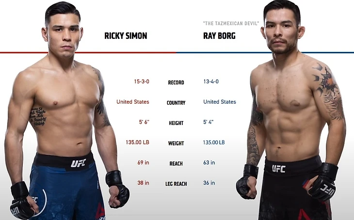 Рэй Борг изначально должен был биться 18 апреля с против Марлона Веры, но в дальнейшем и он и Вера получили новых соперников. Рики Саймон в очень интересной ситуации: его 2 последних боя прошли не очень хорошо. Он проиграл Робу Фонту- мощному ударнику и проиграл нокаутом Юраи Фейберу, хотя он был фаворитом в том бою. И теперь он пробует перезапустить свою карьеру, сразившись с Боргом ,который победил в 2х последних боях, но обычно бьется в 125 фунтах, даже имел там титульный бой против "Могучего мышонка". Но его стиль не очень поможет ему в 135 фунтах. Он больше заточен на борьбу и грязный бокс у сетки, но если это прокатывало в 125 фунтах, то не пройдет в 135. Просто потому что разница в размерах между бойцами этих дивизионов больше, чем между 135 и 145 фунтами например.