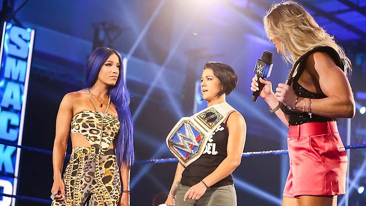 Пришло время для появления "Королевы" всея WWE на синем бренде. Женская чемпионка NXT объяснила своё появление здесь "приглашением" от руководства телеканала FOX, перечислив свои достижения за карьеру. Что разумеется очень не понравилось женской чемпионке SDLive WWE и её подружайке, были бы сомнения конечно. Бэйли зарядила свой спич о том, что Флэр то и дело может хвастаться о том, что у неё всё по жизни через достижения своего папочки. А вот у Бэйли и Саши всё как раз иначе, ибо их дружба привела их к успеху, плюс Бэйли упомянула о звании Гранд-Слэм Чемпионки WWE. Поэтому Флэр, по мнению Бэйли, стоит вернуться в NXT для щедрых дрим-матчей или же на красный бренд, чтобы сливать какую-нибудь Лив Морган, точнее кататься ко всем чертям из Смэка.