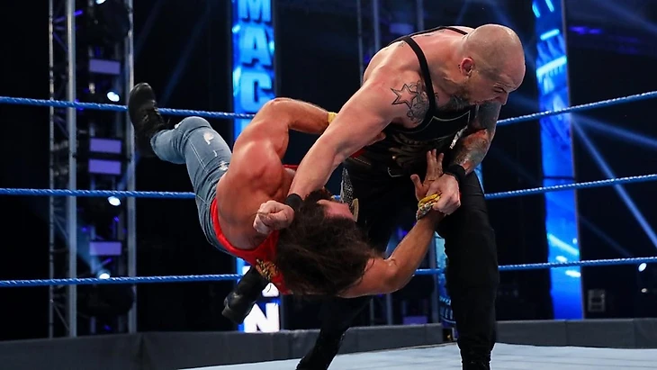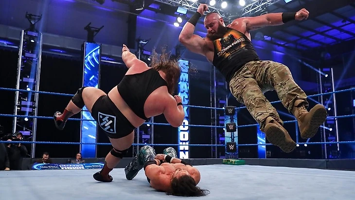 Причём Миз настолько был уверен в своих силах, что провоцировал чемпиона Вселенной - а это опасное дело всё-таки, плюс и Отис не переставал сопротивляться. Миз это почувствовал и вызвал на помощь Моррисона - их попытка двойного snap-суплекса была сорвана аналогичным ответом от одного Отиса, который добрался до Строумэна. А чемпион Вселенной WWE уже никак не щадил бывших командных чемпионов бренда, раскидав тех с ринга в разные стороны рингсайда. Однако это доминирование оказалось краткосрочным - хилы лихо подставили Брона под удар в стойку и уже Моррисон начал со springboard-энзигири контролировать ход очной стычки против чемпиона Вселенной. Только вот и Джон оказался не всесильным - и во время очередного броска против "Монстра", последний ловко перехватил многократного командного и ИК-чемпиона WWE на Running Powerslam...и удержал того до 3.