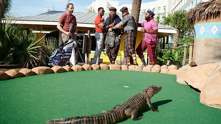 Viking Raiders и Street Profits отправились поиграть в гольф. Причем «Викинги» притащили с собой еду — много мяса. Когда работник гольф-поля сказал, что с едой сюда нельзя, Айвар переложил мясцо из переносного холодильника (?) в сумку с клюшками. Монтез и Анджело, естественно, играли неплохо. У Эрика и Айвара получалось далеко не все, они периодически психовали, метали клюшки к лункам, бросали шары руками. В итоге, Айвар сумел забить один посредством сумасшедшего рикошета. Но следующий же шар, запущенный одним из «Викингов» угодил в посетителя гольф-клуба, не имеющего никакого отношения к этой движухе. Тут же команды решили свалить, но под весом Эрика и Айвара у одного из гольф-каров лопнуло колесо. В итоге, владелец поля выгнал чуваков… и они отправились в какой-то экзотический клуб с мини-гольфом. Какое-то время парни там играли, естественно, у Street Profits опять выходило лучше, а Viking Raiders нарушали дисциплину, но сотрудница клуба их простила… потому что Айвар милый. А Эрик не очень. В итоге, Айвар забил последний шар в лунку, но по общему счету победили все равно Форд и Докинс. И в этом мини-противостоянии победу одержали командные чемпионы со счетом 2:1 (баскетбольную и гольф игры выиграли SP, а за VR осталось метание топоров). «Викинги» как-то не очень хотели мириться с поражением, но суть не в этом. Из лунки, в которую был забит последний шар Айвар сначала достал кошелек, затем стакан с кофе, а потом и ножку индейки. Только он собрался ее съесть, но рядом появился, видимо, китайский аллигатор. Айвар вдруг решил устроить с ним соревнование объявив это словами «все, что ты делаешь, я могу сделать лучше» (название этой серии игр между Street Profits и Viking Raiders). После этого он сделал шаг на встречу хищнику. Но товарищи его остановили (я не знаю, собирался ли он драться с аллигатором или хотел устроить соревнование по поеданию индейки на скорость, но факт остается фактом). Тогда он стал спокойно кушать свою ножку индейки.