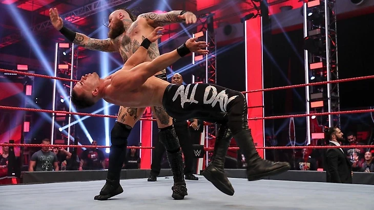 Начали матч очень заряженный на борьбу и веселье Форд и Лэшли. Бобби же срубил его шоулдер тэклом, помучил в углу и добавил флэтлайнер до 2. Тэг ЭмВиПи, и какое-то время плохие ребята мучили Монтеза в своем углу. От суплекса, правда, командный чемпион ушел, отправив в бой Анджело. Вместе Street Profits послали за пределы ринга «Всемогущего», и право ведения боя вернулось к Форду. От его дайва на рингсайд Бобби ушел, а ЭиВиПи отвлек Монтеза, позволив Лэшли сбросить его с апрона тэклом. Затем беднягу познакомили еще и со стойкой ринга, на чем шоу ушло на рекламу. С перерыва мы вернулись, чтобы продолжить наблюдать за страданиями Форда во вражеском углу. Доставалось даже Анджело, но победить у Лэшли с товарищем не получалось. Монтез даже был направлен в стальные ступеньки, но выжил, выбрался из болевого ЭмВиПи, ушел от коронного бута в углу, провел жесткую пощечину и передал «горячий» тэг Докинсу. Естественно, он уничтожил ЭмВиПи своими коронными атаками, отвесил удар Лэшли, которому потом достался «футбольный» тэкл от Форда. Связка из спайнбастера и фрог сплэша прошла к Street Profits, но Лэшли уже пришел в себя и впечатал Анджело лицом в стойку ринга. В ринге он разбил удержание и стал мучить Форда своим фулл нельсоном. Судья открыл отсчет, потому что Бобби все-таки был «нелегальным» участником матча, досчитал до 5, и был вынужден дисквалифицировать «Всемогущего» и его менеджера, так как Лэшли так и не отпустил Монтеза. Не отпустил он и после финального гонга. Мучил беднягу, пока не заиграла музыкальная тема Дрю МакИнтайра. Чемпион WWE влетел в ринг хэдбаттом, но в ответ получил тэйкдаун. Равная борьба продолжилась за пределами ринга, а потом они вернулись в четырехугольник, и Дрю продолжил наносить жесткие удары недругу. Судья вызвал на помощь рестлеров из подготовительного центра, шотланца оттащили, но он раздал обоим ученикам по хэдбатту, после чего получил гарпун. Рефери позвал еще помощь, участников матча за главный титул компании вновь растащили, но он вновь отбились, и драка продолжилась. С третьего раза их все-таки равели по улам, и шоу вышло из эфира.