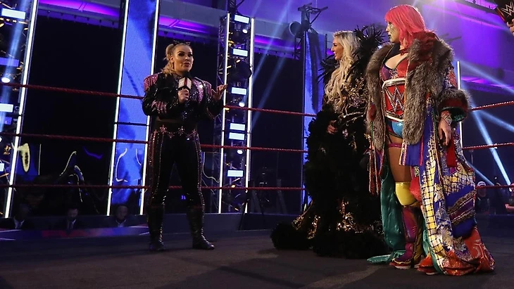 Аска присоединилась к комментаторской панели. Сразу после гонга Флэр атаковала Наталью, но на нее тут же налетела Найя, и, несмотря на попытку вернуться в матч от Шарли, самоанка захватила контроль. Скуп слэм Флэр, затем скуп слэм Наталье на «Королеву», но от легдропа блондинки ушли, отвесив несколько киков Джэкс и направив ее в стойку ринга. Найя осталась на рингсайде приходить в себя, а Наталья с Флэр устроили достаточно классическую борьбу за инициативу. Найя постаралась вернуться в матч, Шарлотт ей этого не позволила, из-за чего попала в сворачивание до 1, за что провела канадке кик. Развить преимущество ей не позволила Джэкс, стянувшая чемпионку NXT с апрона, после чего провела клоузлайн. Она разобрала комментаторский стол, но отвлеклась на Наталью, позволив Флэр атаковать себя столешницей. Достаточно быстро Найя отбилась этой же самой столешницей и они с Шарлотт оказались на апроне, где самоанка получила кучу чопов, попыталась выйти на самоан дроп, однако ее ноги атаковала Нэтти, и все это закончилось двойной бомбой Найе на комментаторский стол. Выражение лица Аски как отдельный вид искусства, а шоу ушло на рекламу.